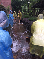 尽管如此,管理处还是组织开展人员一次次地清理路面台阶青苔淤泥,还园区一个清亮、郁葱、洁净的生活空间。大家一大早在工作区域设置警告标志,只见孙师傅拿着长柄刷子用力地把接缝处的淤泥刷出来,对付顽强生长在缝里的植物,孙师傅一点都不马虎,用起子奋力抠掉;对一些顽强的青苔,方师傅洒上药水,过上2、3分钟,再进行清水冲刷。由于面积较大,六个人整整干了半天才总算完成五幢至六幢间的路面青苔清除工作。这样的工作还很多,接下来的梅雨季台风天可能更辛苦,但物业人的责任和担当永远是前进的动力。风雨无阻,这份精神、执着,无不浸透着对工作的热情和家园的爱,在普普通通的工作中显现着物业人的平凡和真诚。