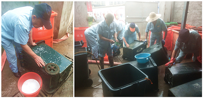 近日,为了贯彻实施区政府关于垃圾桶清洁问题,舟宿环境科在7.3日-7.4日这两天安排街区保洁师傅们在做好街区日常清扫的同时加班加点对街区所有商家的100多只垃圾桶进行了表面重点清洗。化油剂、洗衣粉、铲刀、清洁球齐上阵,碰到油污特别严重的时候,一只桶起码要洗10分钟以上,每个师傅的手都被水泡的发白。