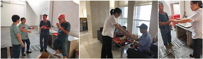 2019年8月7日下午,镇海分公司的领导对镇海B4管理处、宁波银行管理处和外经大厦管理处员工进行了慰问,叮嘱一线员工在辛劳工作的同时注意防暑降温,根据实际合理安排工作时间,确保各项工作有序开展。随后送上了西瓜、冰红茶等降暑食品,让员工在炎炎夏日中感受到了丝丝清凉。