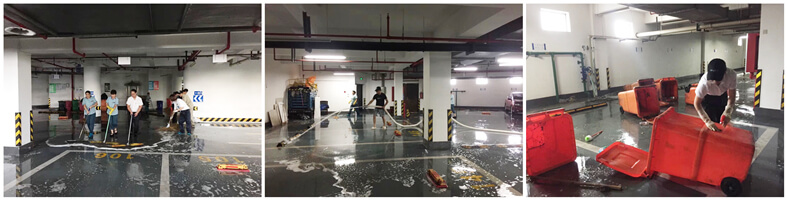 此次清扫工作量较大,物业保洁主管提前对整个清扫工作进行了安排部署,主要通过对地面冲洗去除顽固污渍及垃圾桶的清洗。当天上午,保洁人员们在主任的带领下开展清扫活动,大家手拿扫把及冲洗水管,全身心投入到大扫除中,齐心协力,干的热火朝天,顾不上被水溅湿的鞋子汗湿的衣襟,仍旧不放过任何一个卫生死角,经过一番努力.地下车库焕然一新。