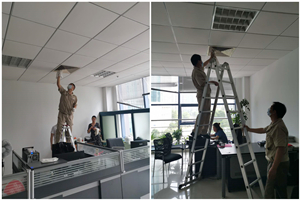中央空调被称为现代建筑之"肺",一旦有新型冠状病毒存在,管道内的灰尘、病毒会随着空调风吹到房间各个角落,逐渐变成室内空气的污染源,对人们的健康造成极大的危害。知此重要性,我物业维修师傅们对中塑商务中心1号楼中央空调的出风口及管道进行了清洗、消毒。